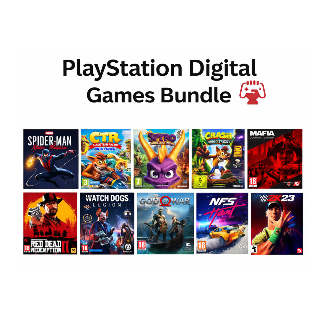10 Games Included for PlayStation Enjoy nonstop gaming with this 10-in-1 Ultimate Game Bundle, featuring legendary titles like Red Dead Redemption 2, God of War (2018), Spider-Man: Miles Morales, WWE 2K23, Need for Speed Heat, Watch Dogs: Legion, Mafia Trilogy, Crash Bandicoot, Spyro Reignited Trilogy, and Crash Team Racing (CTR)—a perfect mix of action, adventure, racing, and sports for endless entertainment in one unbeatable collection.- rdr 2